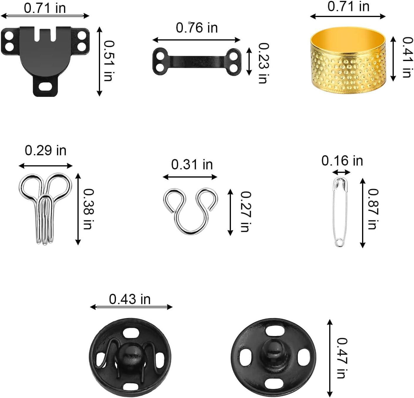 - Package Includes: 112 Pairs Sewing Hooks and Eyes Closure Set Tools with Metal Snaps Buttons Fasteners Press Studs, which includes 40 pairs of snap press buttons , 40 pairs of bra hooks and eyes , and 20 pairs of skirt hooks and eyes,10 safety pins and 2 thimble finger holders.