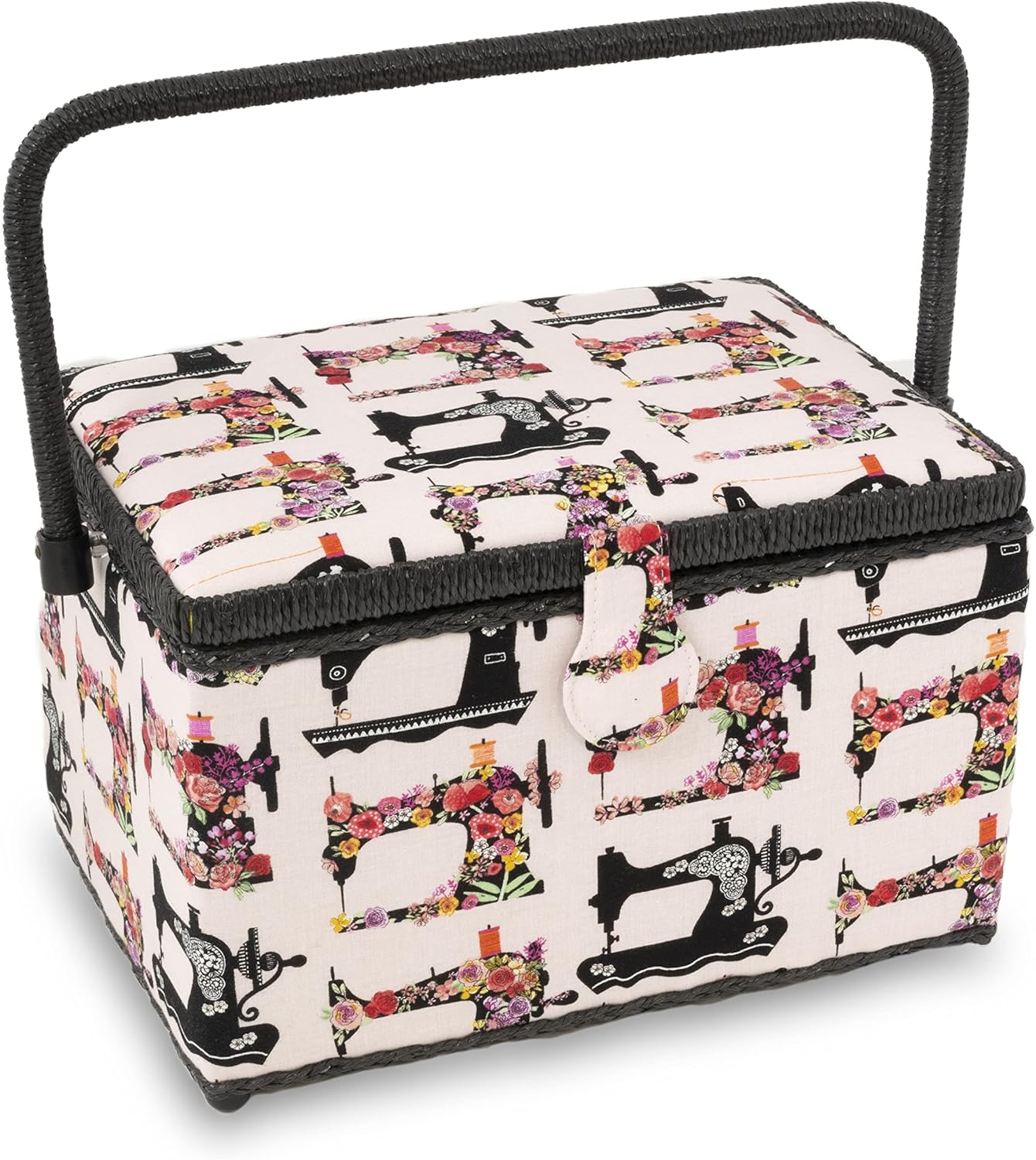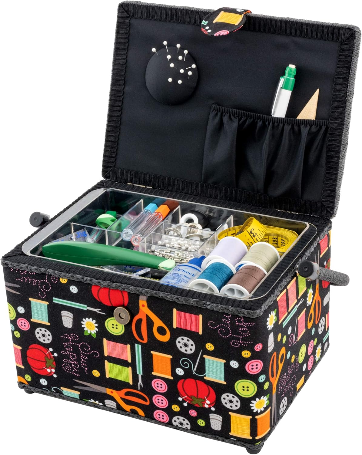A Dritz sewing basket is an attractive, portable solution for storing and organizing essential sewing, quilting or craft supplies. This cheerful basket's brightly colored print stands out on a black background fabric. Trimmed with black cording. A perfect size to keep supplies close at hand.