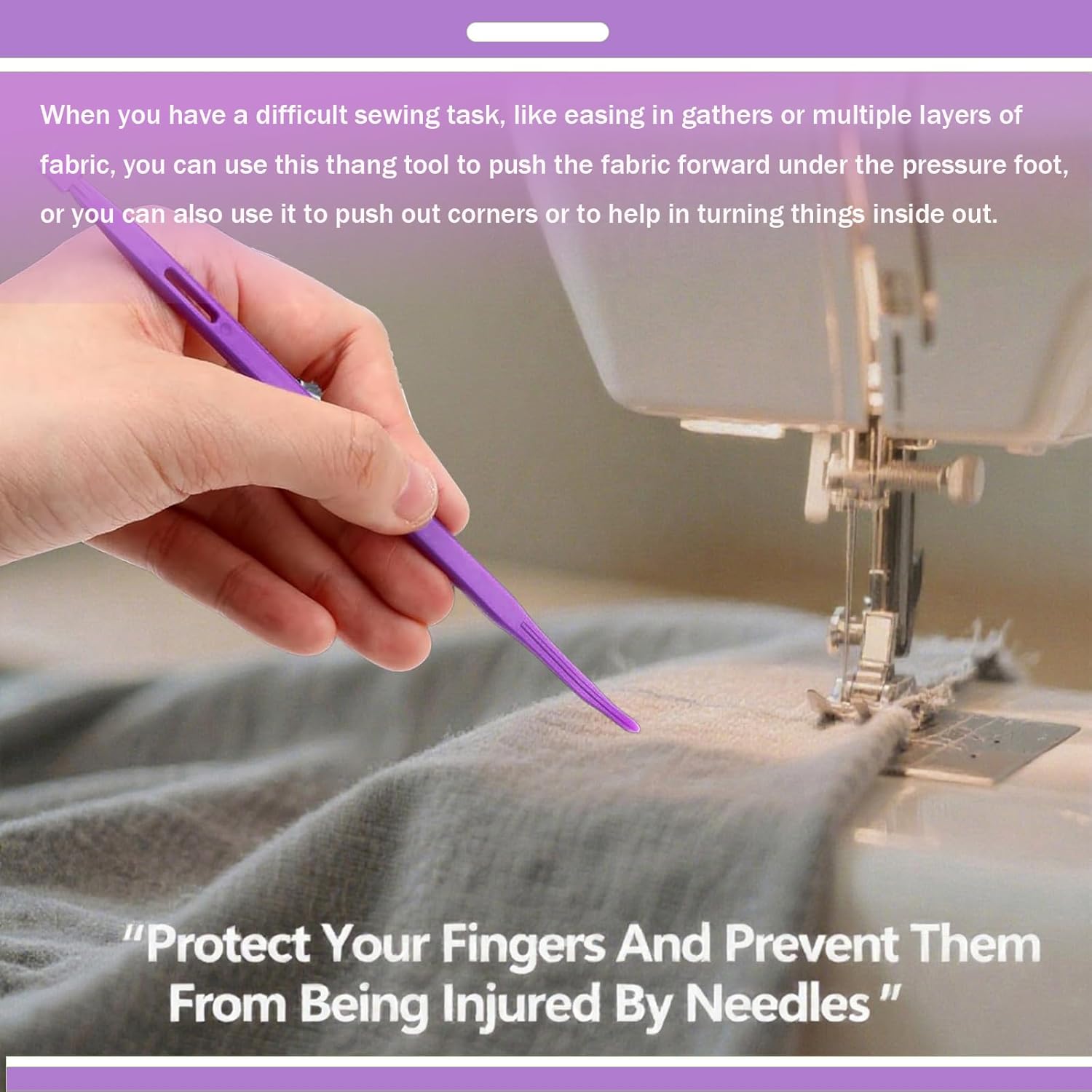 - When you have a difficult sewing task, like easing in gathers or multiple layers of fabric, you can use this thang tool to push the fabric forward under the pressure foot,or you can also use it to push out corners or to help in turning things inside out