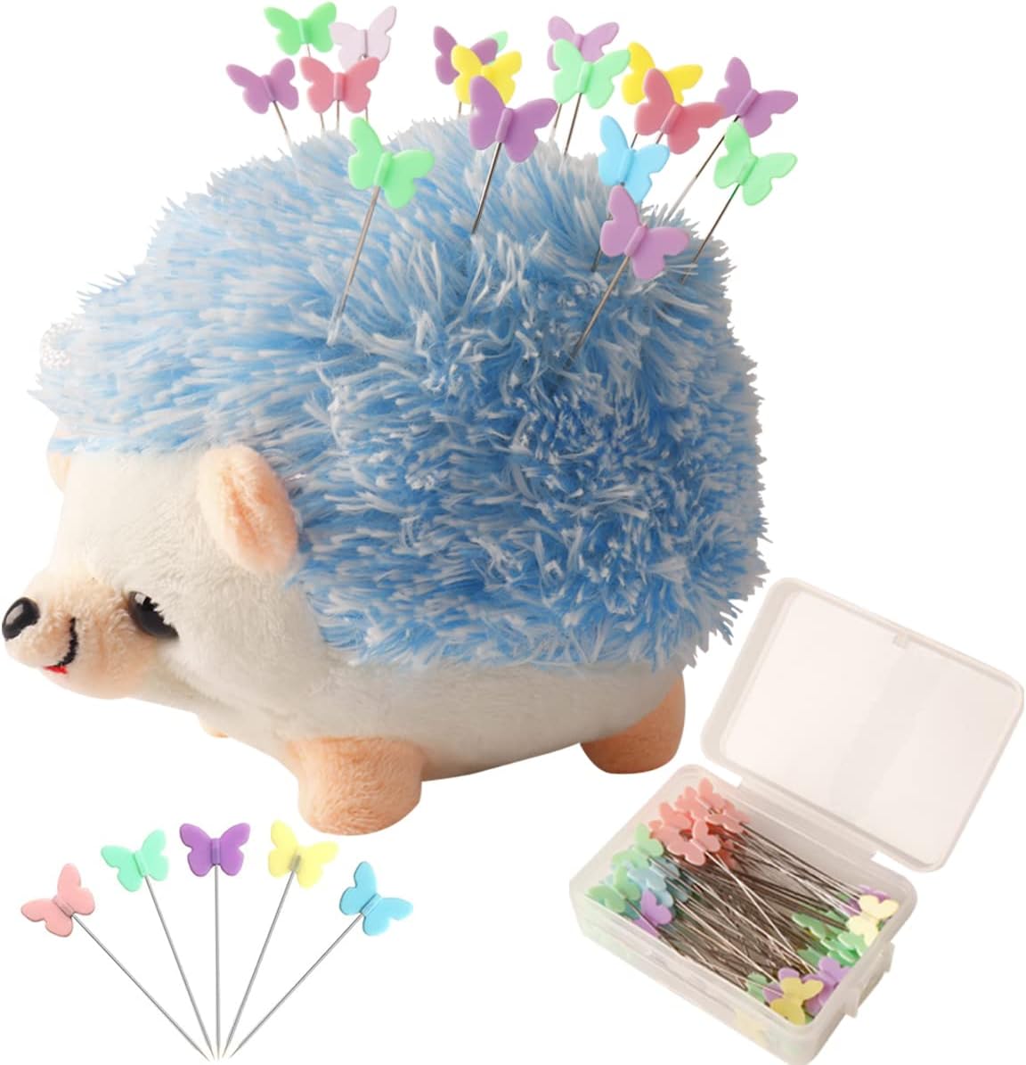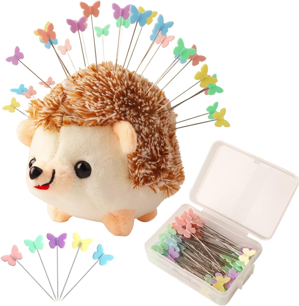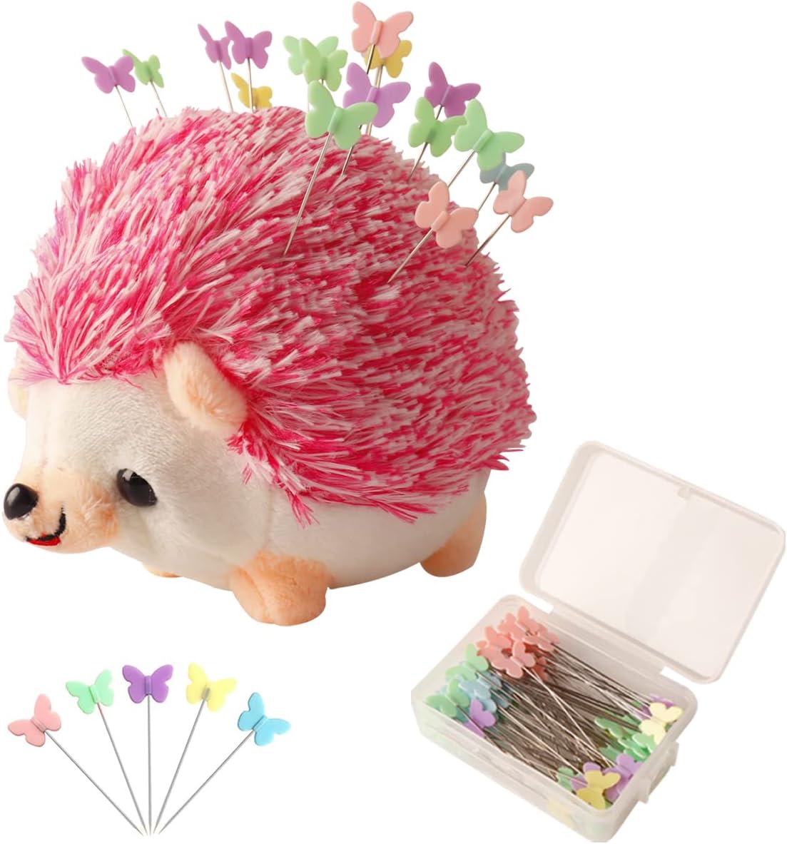 This is a chic set includes a cute hedgehog shape pincushion and a box of colorful butterfly sewing pins.